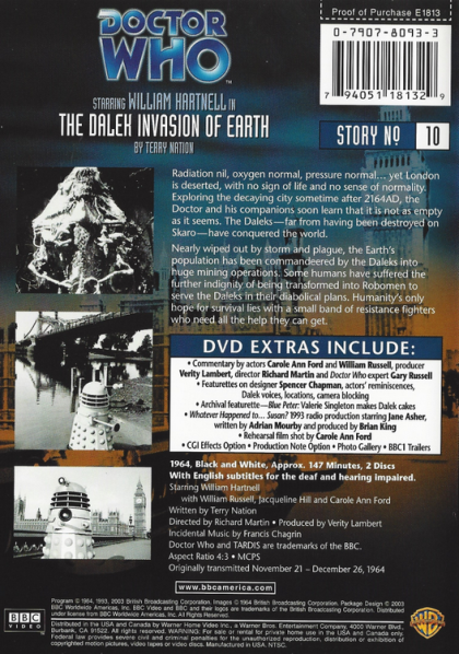 Radiation nil, oxygen normal, pressure normal... yet London is deserted, with no sign of life and no sense of normality. Exploring the decaying city sometime after 2164AD, the Doctor and his companions soon learn that it is not as empty as it seems. The Daleks - far from having been destroyed on Skaro - have conquered the world.