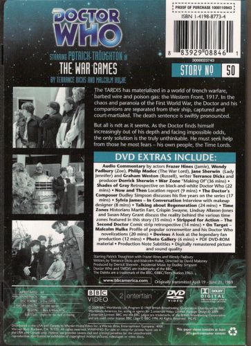 The TARDIS lands in what appears to be the front-line trenches at the height of battle in war-torn France, right in the middle of World War I. Everyone they meet are convinced that the crew are spying and it doesn't take long for the crew to be on the run, but not before breaking the hypnotic conditioning of Carstairs and Lady Jennifer. Having escaped one war-zone they find themselves in another - Roman occupied Britain of some 2,000 years ago, then on to the American Civil War. The situation worstens when the Doctor suspects one of his own people, a Time Lord, to be behind the War Games working for a race of aliens trying to run the wars to their conclusions under controlled conditions to find a super-army or fighters. The Doctor is faced with an impossible situation - not only does the War Lords' control over hundreds of thousands of fighters need to be removed, but the soldiers have to be returned to their natural habitats. He conceeds defeat at the task, knowing that the TARDIS is not equipped for the task. He sends an SOS, calling in his own people even though it is revealed that he is 'on the run' from them for the theft of a TARDIS and for meddling... The Doctor is caught and faces trial.