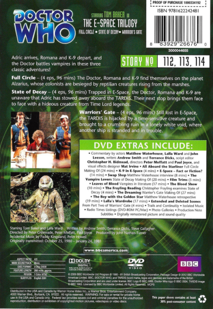 State of Decay - (4 eps, 96 mins) Trapped in E-Space, the Doctor, Romana and K-9 are unaware that Adric has stowed away aboard the TARDIS. Their next stop brings them face to face with a hideous creature from Time Lord legends.
