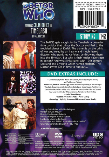 The TARDIS gets caught in the Timelash, a powerful time corridor that brings the Doctor and Peri to the troubled planet of Karfel. The planet is on the brink of war and ruled by an insane and much feared dictator, who punishes Karfelons by throwing them into the Timelash. But why is their leader never seen in person? And what links Karfel with 19th-century Scotland and a young writer named Herbert? The Doctor arrives just in time to find out...
