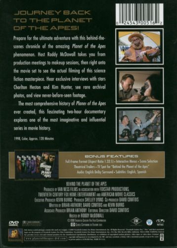 Roddy McDowall takes you, film by film, from production meetings to make-up sessions, then right onto the movie set to see the actual filming of the science fiction masterpiece. The most comprehensive history of Planet of the Apes ever created, this fascinating 127-minute documentary explores one of the most imaginative and influential series in movie history.