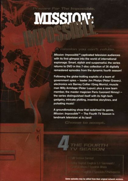 This 7-year series chronicled the adventures of the Impossible Mission Taskforce (IMF), a team of government spies and specialists who were assigned "impossible missions" by the unseen "Secretary". Although the cast varied over the years, the main characters included The Team Leader (Dan Briggs the first season, then Jim Phelps the other six), The Techno-Wizard (Barney Collier), The Strongman (Willy Armitage), The Master of Disguise (first Rollin Hand, then The Amazing Paris), and The Femme Fatale (Cinnamon Carter, Casey, Dana Lambert, Mimi Davis). The series is best known for its opening mission assignment (conducted by a pre-recorded tape), the leader's selection of mission agents from a dossier, the opening briefing, the intricate use of disguises and a typical "mask pulloff" scene near the end of most episodes, and the relative lack of characterization of the characters.