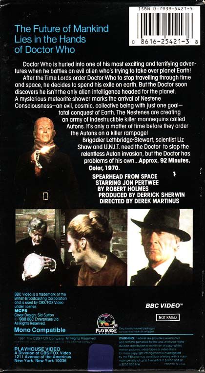 Aided by newly-recruited UNIT scientist Dr Elizabeth Shaw, the Doctor thwarts this scheme by repelling the Nestene consciousness into space and thereby neutralising the Autons and the monstrous tentacled form that it has been creating for itself in a tank within the factory. Channing, revealed to be no more than a sophisticated Auton, is likewise deactivated.