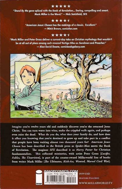 story MARK MILLAR art & cover PETER GROSS From the writer of WAR HEROES, KICK ASS and the Universal hit, WANTED! It's the next MARK MILLAR graphic novel set to become a feature film! AMERICAN JESUS, VOL. 1: CHOSEN follows a twelve-year-old boy who suddenly discovers he's the returned Jesus Christ. He can turn water into wine, make the crippled walk and perhaps even raise the dead. How will he deal with the destiny to lead the world in a conflict thousands of years in the making?
