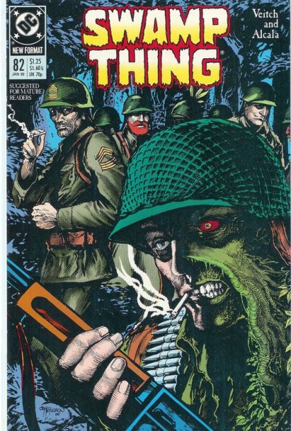 Swamp Thing shows up in a most unexpected place...in the middle of a war with Sgt. Rock and the men of Easy Company. Written and pencilled by Rick Veitch, and inked by Alfredo Alcala. Cover by John Totleben. Suggested for Mature Readers. New Format. Cover price $1.25.