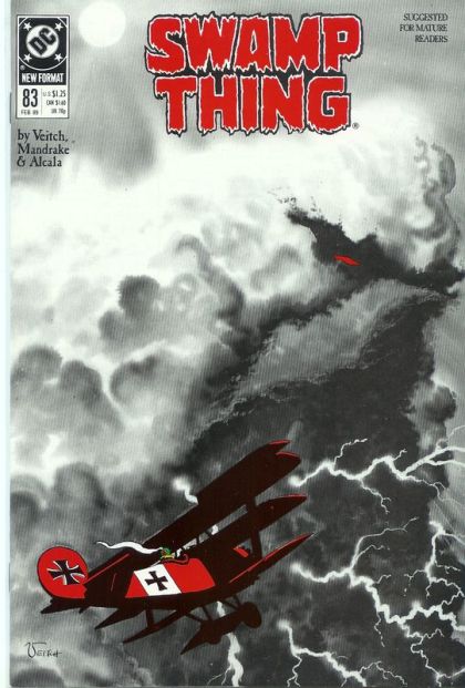 Swamp Thing continues his baffling journey through time, landing in the middle of World War I and the killer skies. Guest-starring Enemy Ace and the Arcane family. Written by Rick Veitch, with art by Tom Mandrake and Alfredo Alcala. Cover by Veitch. Suggested for Mature Readers. New Format. Cover price $1.25.