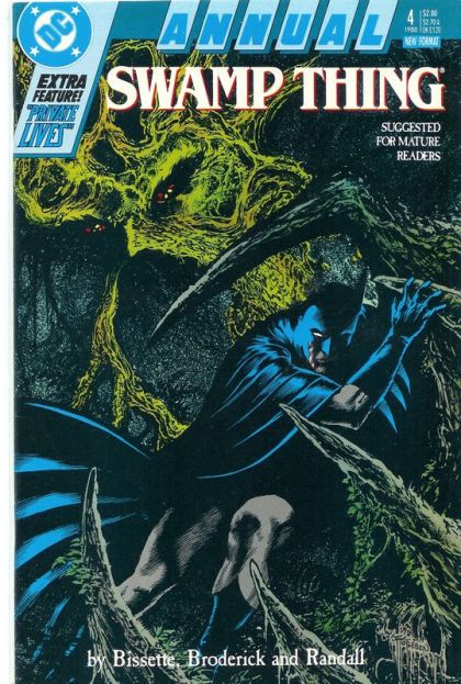 When Gothamites start suffering from a mysterious ailment, Batman goes in search of Swamp Thing for some answers in "Threads". Script by Stephen R. Bissette, pencils by Pat Broderick, inks by Ron Randall and Eduardo Barreto. Cameos by Commissioner Gordon, Harvey Bullock, Poison Ivy. Bonus 'Private Lives' tale: Etienne Pitrie stars in "Traiteur" by Bissette and artist Mike Hoffman. 48 pages of stories. John Totleben cover. Cover price $2.00.