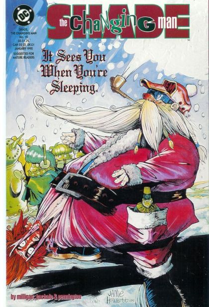 Ho ho ho! Shade faces the holidays in the small American town of Bethlehem with something less than enthusiasm as he recalls Christmases past on his homeworld, Meta. Then he meets a man who is looking for a new messiah, a man who, instead of following a star, is following the madness. Written by Peter Milligan, with art by Chris Bachalo and Mark Pennington. Painted cover by Jamie Hewlett. Suggested for Mature Readers. New Format. Cover price $1.75.