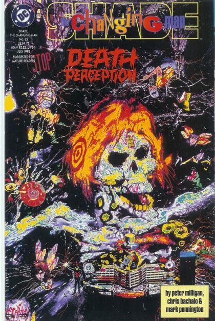 In part 5 of the 5-part 'The Road,' Shade discovers what lies in the ditch and the Changing Man must face the ultimate challenge - deciding where to go when there's nowhere left to run! Written by Peter Milligan, with art by Chris Bachalo and Mark Pennington. Painted cover by Brendan McCarthy. Suggested for Mature Readers. New Format. Cover price $1.75.
