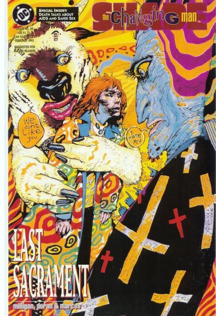 Part 2 of the 2-part 'Ernest and Jim.' A portrait of the artist in the area of madness continues as Shade drags James Joyce and Ernest Hemingway into a vortex that eventually pulls them into present-day L.A. Written by Peter Milligan, with art by Colleen Doran and Pablo Marcos. This issue also contains an AIDS awareness story by Neil Gaiman and Dave McKean. Painted cover by Brendan McCarthy. 40 pages. Suggested for Mature Readers. New Format. Cover price $1.75.