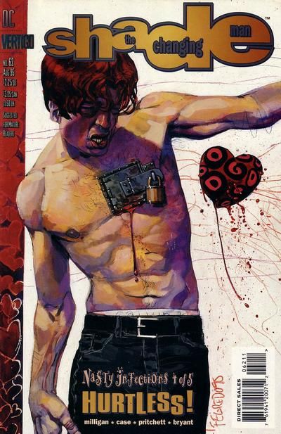 Part 4 of the 5-part 'Nasty Infections.' Shade battles the Grotesque as the Changing Man attempts to free his friends from a mysterious virus. Written by Peter Milligan, with art by Richard Case, Andy Pritchett and Rick Bryant. Painted cover by Duncan Fegredo. Suggested for Mature Readers. Mando Format. Cover price $2.25.