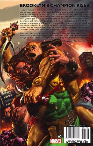 Hercules returns to the mortal world - but now he's one of us, stripped of his godly status by the Chaos War. Outfitted with an arsenal of mythical weapons along with his usual good looks and otherworldly charm, Herc takes to the streets of Brooklyn, where the locals anoint their former god their new champion! But when the Asgardian God of Fear unleashed his army on New York, spreading terror among the masses, only Herc stands in the way! Then, Herc swings into action as the Amazing Spider-Herc when the infestation of Spider-Island turns his world upside-down!