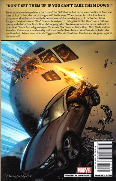 Written by ANDY DIGGLE Art by DAVIDE GIANFELICE Covers by BUTCH GUICE 'Don't set them up if you can't take them down!' Times may have changed since the days of the Old West, but in the war-torn South American state of San Diablo, the law of the gun still holds sway. When former hero-for-hire Maria Vasquez, alias Tarantula, finds herself wanted for murder south of the border, Texas Rangers Division lawman 'Tex' Dawson is assigned to bring her in. But they're on a collision course with the outlaw Black Riders biker gang, who plan to make sure she never makes it to trial alive? Classic Marvel gunslingers Tarantula, Tex Dawson, Black Rider, Matt Slade and the Two-Gun Kid are given a modern-day makeover in this hard-bitten tale of blood and bullets by the DAREDEVIL: REBORN team of Andy Diggle and Davide Gianfelice. Five heroes, six guns?against six hundred! 32 PGS. (each)/Parental Advisory