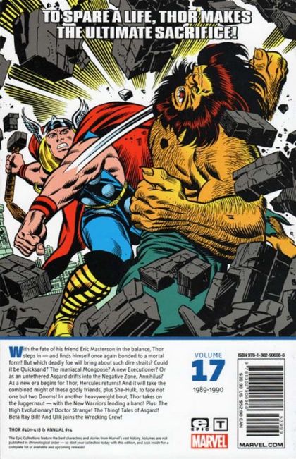 To spare a life, Thor makes the ultimate sacrifice! With the fate of his friend Eric Masterson in the balance, Thor steps in - and finds himself once again bonded to a mortal form! But which deadly foe will bring about such dire straits? Could it be Quicksand? The maniacal Mongoose? A new Executioner? Or as an untethered Asgard drifts into the Negative Zone, Annihilus? As a new era begins for Thor, another legendary hero returns: Zounds, it's Hercules! It will take the combined might of these godly friends, plus She-Hulk, to face not one but two Dooms! In another heavyweight bout, Thor takes on the Juggernaut - with the New Warriors lending a hand! Plus: The High Evolutionary! Doctor Strange! The Thing! Tales of Asgard! Beta Ray Bill! And Ulik joins the Wrecking Crew! Collecting THOR (1966) #401-418 and ANNUAL #14. Rated T