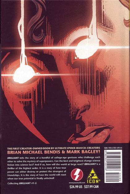 The first creator-owned book by ULTIMATE SPIDER-MAN co-creators Brian Michael Bendis and Mark Bagley, BRILLIANT tells the story of a handful of college-age geniuses who challenge each other to solve the mystery of superpowers. Can the best and brightest change science fiction into science fact? And if so, how will the world at large react? BRILLIANT is a thriller of the highest order. It is a story of how true power can either destroy or protect the strongest of friendships. It is the story of how the world will react when our true potential is finally unlocked. Collecting BRILLIANT #1-7.