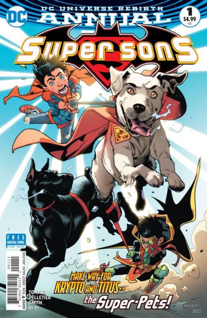 "SUPER-PETS UNLEASHED"! The World's Furriest team Krypto and Titus-together at last! Tired of the boys stealing the spotlight, the doggy duo lead the Super Sons on a canine-powered epic!