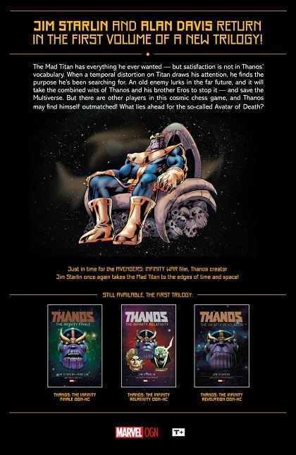 Jim Starlin and Alan Davis return in the first volume of a new trilogy! The Mad Titan has everything he ever wanted - but satisfaction is not in Thanos' vocabulary. When a temporal distortion on Titan draws his attention, he finds the purpose he's been searching for: saving himself! An old enemy lurks in the far future, and it will take the combined wits of Thanos, his brother Eros and time-travel master Kang the Conqueror to stop it - and save the Multiverse. But there are other players in this cosmic chess game - and Thanos may find himself outmatched! What lies ahead for the so-called Avatar of Death? Rated T+