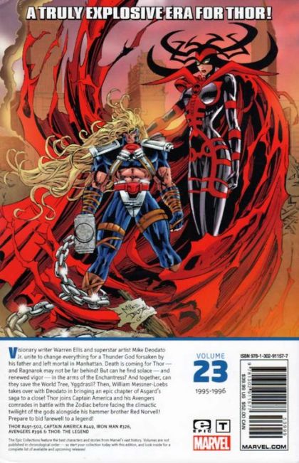 A truly explosive era for Thor! Visionary writer Warren Ellis and superstar artist Mike Deodato Jr. unite to change everything for a Thunder God forsaken by his father and left mortal in Manhattan. Death is coming for Thor - and Ragnarok may not be far behind! But can he find solace - and renewed vigor - in the arms of the Enchantress? And together, can they save the World Tree, Yggdrasil? Then, William Messner-Loebs takes over with Deodato in bringing an epic chapter of Asgard's saga to a close! Thor joins Captain America and his Avengers comrades in battle with the Zodiac before facing the climactic twilight of the gods alongside his hammer brother Red Norvell! Prepare to bid farewell to a legend! Collecting THOR (1966) #491-502, CAPTAIN AMERICA (1968) #449, IRON MAN (1968) #326, AVENGERS (1963) #396 and THOR: THE LEGEND. Rated T