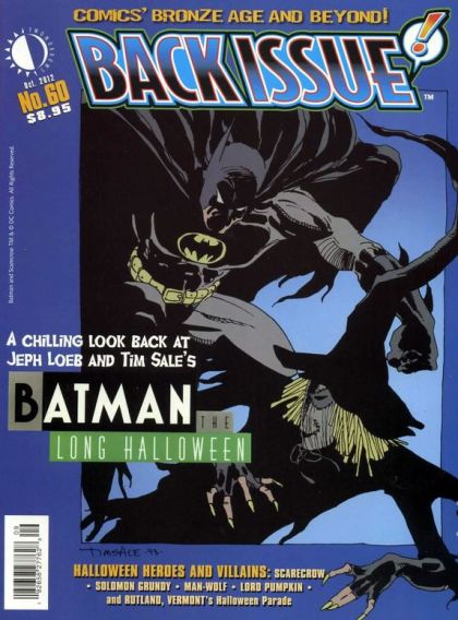 Back Issue #60 scares up 'Halloween Heroes and Villains'! Cover-featuring a look back at Jeph Loeb and Tim Sale's chiller Batman: The Long Halloween. Also: the Scarecrow (both the DC and Marvel versions), Solomon Grundy, Man-Wolf, Lord Pumpkin, Rutland, Vermont's Halloween parades, and the Korvac Saga's Dead Avengers! Batman vs. Scarecrow cover by Tim Sale!