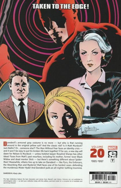 Taken to the edge! Daredevil's armored gray costume is no more - but who is that running around in the original yellow suit? And the classic red? Is it Matt Murdock? Jack Batlin? Or...someone else?! The Man Without Fear faces an identity crisis - and it won't be easy to put his broken life back together! If he can, a new day will dawn for Nelson & Murdock - unless hotshot lawyer Rosalind Sharpe has other ideas! Faces from Matt's past resurface, including his mother, former lover Black Widow and dead mentor Stick - but there's something different about Spider-Man! Meanwhile, villains line up to take on Daredevil - like Pyro, the Enforcers, the Absorbing Man and Mysterio! Matt faces one of his hardest cases: defending the murderous Mister Hyde! And DD pulls an all-nighter battling Insomnia! Collecting DAREDEVIL (1964) #345-364. Rated T