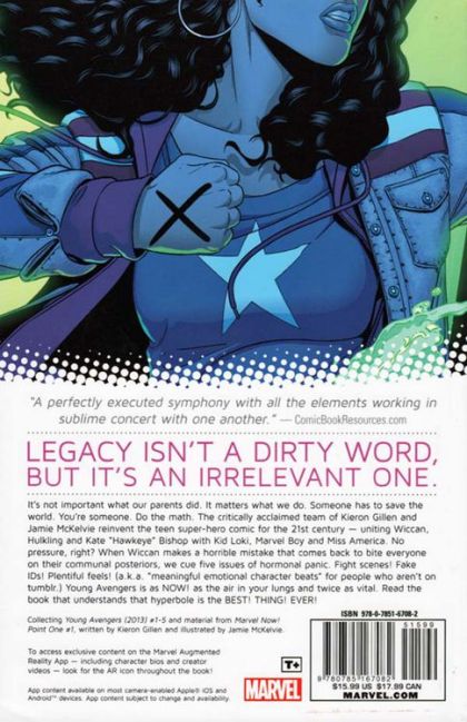 Legacy isn't a dirty word, but it's an irrelevant one. It's not important what our parents did. It matters what WE do. Someone has to save the world. You're someone. Do the math. The critically acclaimed team of Kieron Gillen and Jamie McKelvie reinvent the teen super-hero comic for the 21st century, uniting Wiccan, Hulkling and Kate 'Hawkeye' Bishop with Kid Loki, Marvel Boy and Ms. America. No pressure, right? As a figure from Loki's past emerges, Wiccan makes a horrible mistake that comes back to bite everyone on their communal posteriors. Fight scenes! Fake IDs! Plentiful feels! (a.k.a. 'meaningful emotional character beats' for people who aren't on tumblr.) Young Avengers is as NOW! as the air in your lungs and twice as vital. Hyperbole is the BEST! THING! EVER! Collecting YOUNG AVENGERS (2013) #1-5 and material from MARVEL NOW! POINT ONE #1.