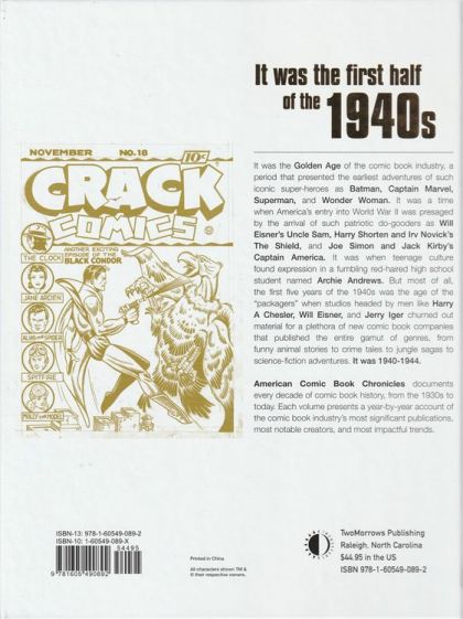 The American Comic Book Chronicles continues! Kurt Mitchell and editor Roy Thomas composed this volume about the "Golden Age" of the comic book industry, a five-year period that presented the earliest adventures of such iconic super-heroes as Batman, Captain Marvel, Superman, and Wonder Woman. It was a time when America's entry into World War II was presaged by the arrival of such patriotic do-gooders as Will Eisner's Uncle Sam, Harry Shorten and Irv Novick's The Shield, and Joe Simon and Jack Kirby's Captain America. It was when teenage culture found expression in a fumbling red-haired high school student named Archie Andrews. But most of all, the first five years of the 1940s was the age of the "packagers" when studios headed by men like Harry A Chesler, Will Eisner, and Jerry Iger churned out material for a plethora of new comic book companies that published the entire gamut of genres, from funny animal stories to crime tales to jungle sagas to science-fiction adventures. These are just a few of the events chronicled in this exhaustive, full-color hardcover.