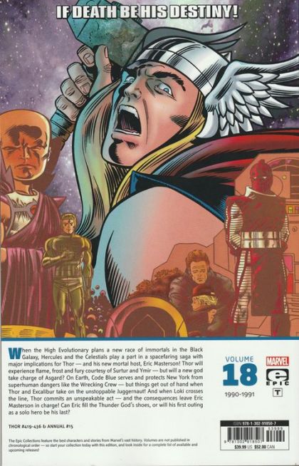 If death be his destiny! When the High Evolutionary plans a new race of immortals in the Black Galaxy, Hercules and the Celestials play a part in a spacefaring saga with major implications for Thor - and his new mortal host, Eric Masterson! Thor will experience flame, frost and fury courtesy of Surtur and Ymir - but will a new god take charge of Asgard? On Earth, Code Blue serves and protects New York from superhuman dangers like the Wrecking Crew - but things get out of hand when Thor and Excalibur take on the unstoppable Juggernaut! And when Loki crosses the line, Thor commits an unspeakable act - and the consequences leave Eric Masterson in charge! Can Eric fill the Thunder God's shoes, or will his first outing as a solo hero be his last? Collecting THOR (1966) #419-436 and ANNUAL #15. Rated T