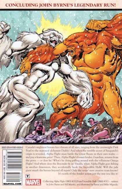 Concluding John Byrne's legendary run! Canada's mightiest heroes face threats of all sizes, ranging from the overweight Pink Pearl to the maniacal alchemist Diablo! And when the terrible secret of Sasquatch's origin is revealed, Alpha Flight must battle the Great Beasts in their own realm - and pay a fearsome price! Then, Alpha Flight's former leader, Guardian, returns from the grave - or does he? What's he doing palling around with the villainous Omega Flight? And where does the Beyonder fit in? Finally, when Alpha Flight goes fishing in another dimension, they accidentally hook the Incredible Hulk! Will the jade giant smash the heroes beyond all repair? Only the series' new creative team knows! It's north-of-the-border action just the way you like it! Collecting ALPHA FLIGHT (1983) #20-29 and INCREDIBLE HULK (1968) #313.