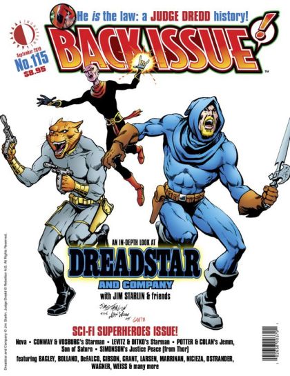 Back Issue #115 blasts off with Sci-Fi Superheroes! In-depth looks at Jim Starlin's Dreadstar and Company, and the dystopian lawman Judge Dredd. Also: Nova, Gerry Conway & Mike Vosburg's Starman, Paul Levitz & Steve Ditko's Starman, Walter Simonson's Justice Peace (from the pages of Thor), and Greg Potter & Gene Colan's Jemm, Son of Saturn. Featuring Mark Bagley, Brian Bolland, Peter David, Tom DeFalco, Ian Gibson, Erik Larsen, Chris Marrinan, Fabian Nicieza, John Wagner, and more. Dreadstar and Company cover by Starlin and Alan Weiss. Edited by Michael Eury.