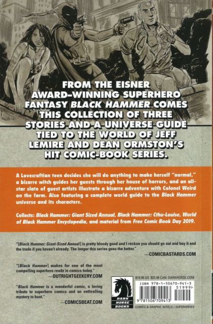 A Lovecraftian teen decides she will do anything to make herself "normal," a bizarre witch guides her guests through her house of horrors, and an all-star slate of guest artists illustrate a bizarre adventure with Colonial Weird on the farm. Also featuring a complete world guide to the Black Hammer universe and its characters. Collects: Black Hammer: Giant Sized Annual, Black Hammer: Cthu-Louise, World of Black Hammer, and material from Free Comic Book Day 2019.