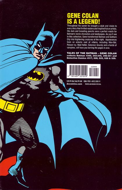 Written by GERRY CONWAY, ROY THOMAS, PAUL LEVITZ and DOUG MOENCH ? Art by GENE COLAN and others Cover by GENE COLAN and DICK GIORDANO For the first time, DC Comics collects the moody Batman stories drawn by comics legend Gene Colan, with appearances by some of Batman's greatest foes, including Man-Bat, The Monk, Rupert Thorne and more. Collecting BATMAN #340, 343-345 and 348-351 and DETECTIVE COMICS #510, 512, 517, 528 and 529. On sale JULY 20 ? 288 pg, FC, $39.99 US