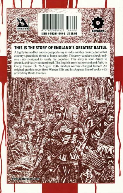 (W) Warren Ellis (A) Raulo Caceres (C) Felipe Massafera An all-new printing on the critically acclaimed Warren Ellis historical epic, Crecy! A highly trained but under equipped army invades another country due to that country's perceived threat to home security. The army conducts shock-and-awe raids designed to terrify the populace. This army is soon driven to ground, and vastly outnumbered. The English army has to stand and fight, in Crecy, France. On 26 August 1346, modern warfare changed forever. This is the story of England's greatest battle. Featuring the stunningly detailed art of Raulo Caceres. MATURE THEMES