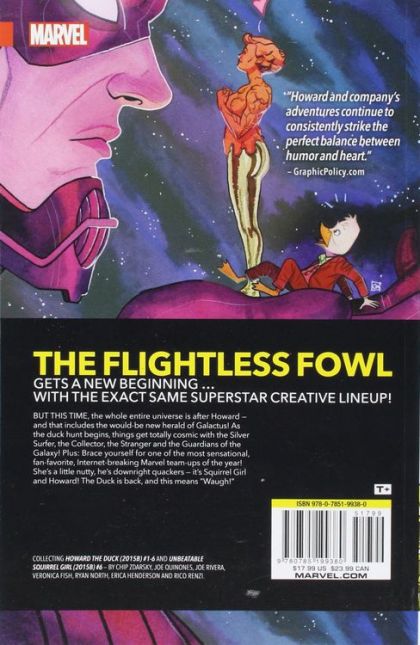 Trapped in a world he's grown accustomed to! The flightless fowl gets a new beginning, with the exact same superstar creative lineup as before! But this time, the whole entire universe is after Howard - and that includes the would-be new herald of Galactus! As the duck hunt begins, things get totally cosmic with the Silver Surfer, the Collector, the Stranger and the Guardians of the Galaxy! Plus: Brace yourself for the two most sensational, fan-favorite, Internet-breaking Marvel team-ups of the year! She's a little nutty, he's downright quackers - it's Squirrel Girl and Howard! And in a tale that will launch a thousand cosplay double-acts, meet Gwenpool! The Duck is back, and this means 'Waugh!' Collecting HOWARD THE DUCK (2015B) #1-6 and UNBEATABLE SQUIRREL GIRL (2015B) #6. Rated T+