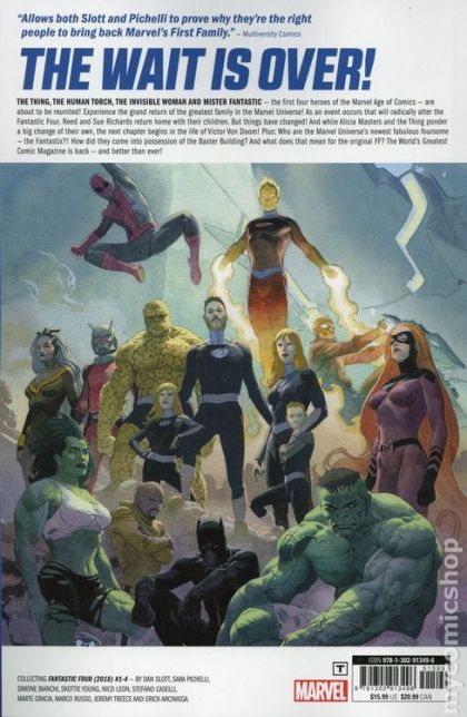 The wait is over! The Thing, the Human Torch, the Invisible Woman and Mister Fantastic - the first four heroes of the Marvel Age of Comics - are about to be reunited! Experience the grand return of the greatest family in the Marvel Universe! As an event occurs that will radically alter the Fantastic Four, Reed and Sue Richards return home with their children. But things have changed! And while Alicia Masters and the Thing ponder a big change of their own, the next chapter begins in the life of Victor Von Doom! Plus: Who are the Marvel Universe's newest fabulous foursome - the Fantastix?! How did they come into possession of the Baxter Building? And what does that mean for the original FF? The World's Greatest Comic Magazine is back - and better than ever! Collecting FANTASTIC FOUR (2018) #1-4. Rated T
