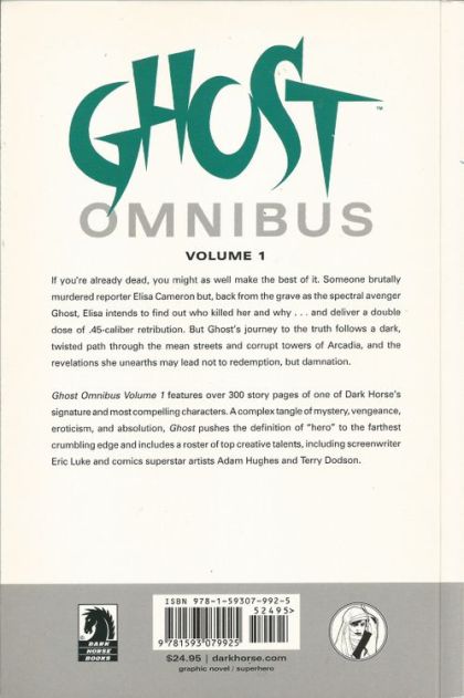 GHOST OMNIBUS VOLUME 1 Eric Luke (W), Adam Hughes (A), Terry Dodson (A), Scott Benefiel (A), Matt Haley (A), Adam Hughes (Cover), and others On sale Oct 22 FC, 352 pages $24.95 TPB, 6' x 9' If you're already dead, you might as well make the best of it. Someone brutally murdered reporter Elisa Cameron, but back from the grave as the spectral avenger Ghost, Elisa intends to find out who killed her and why . . . and grab a double dose of .45-caliber retribution. But Ghost's journey to the truth follows a dark, twisted path, and the revelations she unearths may lead not to redemption, but damnation. ? Includes a roster of top creative talents, including screenwriter Eric Luke and comics superstar artists Adam Hughes and Terry Dodson. ? Collects Ghost Special #1, Ghost #1-12 (first series), and 'Sweet Things' from Decade of Dark Horse #2.