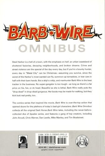 BARB WIRE OMNIBUS John Arcudi (W), Chris Warner (W/A/Cover), Dan Lawlis (A), Mike Manley (A), Ian Akin (A), and Tim Bradstreet (A) On sale Sept. 10 FC, 320 pages $24.95 TPB, 6' x 9' Steel Harbor is a hell of a town, with the emphasis on hell, an urban wasteland of shuttered factories, decaying neighborhoods, and broken dreams. Crime and street violence are the soup of the day every day, but if you're a bounty hunter, every day in 'Metal City' can be Christmas-assuming you survive, since the worst of the Harbor's most wanted can fly, summon up tornadoes, or tear cars in half with their bare hands. But a skip's a skip, and manhunter Barb Wire is the best tracker in the business, and no super-gangster is too tough-as long as there's a fat price on his, her, or its head. Beautiful as she is lethal, Barb Wire really puts the 'drop dead' in drop-dead gorgeous. Her boots may be made for walking, but they kick butt real pretty too. ? Barb Wire Omnibus collects all the original Dark Horse Barb Wire tales, including the never-before-collected Ace of Spades series.