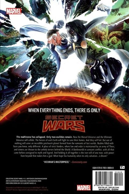 The Marvel Universe is no more! The interdimensional Incursions have eliminated each and every alternate universe one by one. And now - despite the best efforts of the scientists, sages and superhumans - the Marvel Universe and Ultimate Universe have collidedand been destroyed! All that exists in the vast empty cosmos is a single, titanic patchwork planet made of the fragmented remains of hundreds of devastated dimensions: Battleworld! And the survivors of this multiversal catastrophe all bend their knee to Battleworld's master: Doctor Doom! What strange creatures inhabit this world? Which familiar faces will return? And what happens when Battleworld's various domains go to war? The Marvel Universe is dead - and the victors of the Secret Wars will determine what comes next! Collecting SECRET WARS (2015) #1-8 and material from FREE COMIC BOOK DAY 2015: SECRET WARS #0. Rated T+