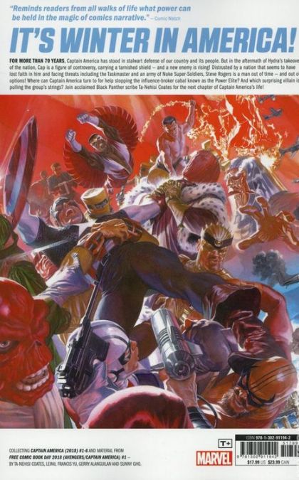 It's winter in America! For more than 70 years, Captain America has stood in stalwart defense of our country and its people. But in the aftermath of Hydra's takeover of the nation, Cap is a figure of controversy, carrying a tarnished shield - and a new enemy is rising! Distrusted by a nation that seems to have lost faith in him, and facing threats including the Taskmaster and an army of Nuke super-soldiers, Steve Rogers is a man out of time - and out of options! Where can Captain America turn for help stopping the influence-broker cabal known as the Power Elite? And which surprising villain is pulling the group's strings? Join acclaimed BLACK PANTHER scribe Ta-Nehisi Coates for the next chapter of Captain America's life! Collecting CAPTAIN AMERICA (2018) #1-6 and material from FREE COMIC BOOK DAY 2018 (AVENGERS/CAPTAIN AMERICA). Rated T+