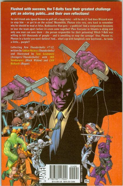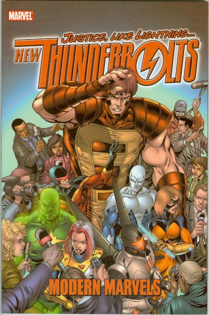 "Modern Marvels!" Collects New Thunderbolts (2005-2006) #7-12. Written by FABIAN NICIEZA. Art by TOM GRUMMETT and BILL SIENKIEWICZ. Cover by TOM GRUMMETT. Flushed with success, the Big Apple's newest heroes have to face their greatest challenge yet: an adoring public and the reflections in their mirrors! An old friend asks Speed Demon to pull off a huge heist -- will he do it? And does Blizzard want to stop him -- or get in on the action? Meanwhile, Photon tries very, very hard to remember why he should be mad at Atlas. Radioactive Man gets -- a publicist? And a resignation threatens to tear the team apart before it's even come together! Plus: Everyone in Atlantis is dying and only one man can save them -- the person responsible for their poisoning! Which T-Bolt was willing to kill thousands of people -- and is unwilling to stop the carnage? Also, Photon vs. Photon in a battle you won't believe! And...what's up with Songbird's new boyfriend...he looks a little...purple. Softcover, 144 pages, full color. Cover price $14.99.