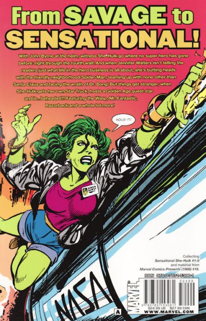 Written by JOHN BYRNE Penciled by JOHN BYRNE Cover by JOHN BYRNE From SAVAGE to SENSATIONAL! With John Byrne at the helm, witness She-Hulk go where no super hero has gone before: right through the fourth wall! Vs. Spider-Man! Beheaded! Against the wrath of Dr. Bong! Alongside Santa Claus! On her own Star Truck! Hosting a Golden Age guest star! Featuring the Wasp, Mr. Fantastic and Razorback! Collecting SENSATIONAL SHE-HULK #1-8 and material from MARVEL COMICS PRESENTS (1988) #18. 200 PGS./Rated A