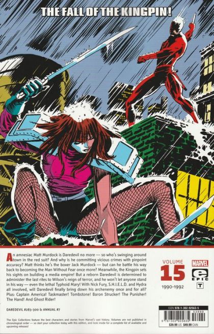 The fall of the Kingpin! An amnesiac Matt Murdock is Daredevil no more - so who's swinging around town in the red suit? And why is he committing vicious crimes with pinpoint accuracy? Matt thinks he's the boxer Jack Murdock - but can he battle his way back to becoming the Man Without Fear once more? Meanwhile, the Kingpin sets his sights on building a media empire! But a reborn Daredevil is determined to administer the last rites to Wilson's reign of terror, and he won't let anyone stand in his way - even the lethal Typhoid Mary! With Nick Fury, S.H.I.E.L.D. and Hydra all involved, will Daredevil finally bring down his archenemy once and for all? Plus: Captain America! Taskmaster! Tombstone! Baron Strucker! The Punisher! The Hand! And Ghost Rider! Collecting DAREDEVIL (1964) #283-300 and ANNUAL #7. Rated T