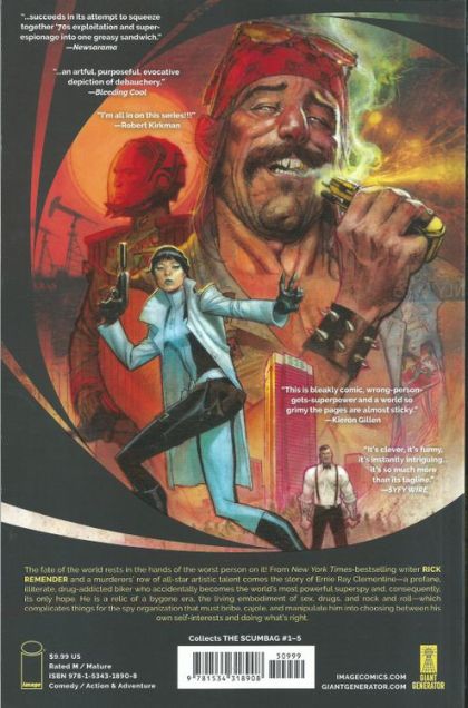 The fate of the world rests in the hands of the worst person on it! From New York Times best selling writer RICK REMENDER and a murderers' row of all-star artistic talent, comes the story of Ernie Ray Clementine - a profane, illiterate, drug-addicted biker with a fifth-grade education accidentally received a power-imbuing serum making him the world's most powerful super spy. He is a relic of a bygone era, the living embodiment of sex, drugs, and rock and roll - so, this doesn't make things easy for the spy organization that needs his help as they bribe, cajole, and manipulate him to choose between his own self-interests and doing what's right. Collects THE SCUMBAG #1-5.