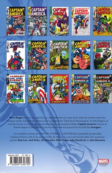 Cette troisième INTÉGRALE consacrée à Captain America rassemble les épisodes 106 à 120, écrits et dessinés par Stan Lee, Jack Kirby, Jim Steranko, John Romita Sr, Gene Colan et John Buscema ! De mémorables pages qui ont marqué l’histoire Marvel. Indispensable à tout passionné qui se respecte !