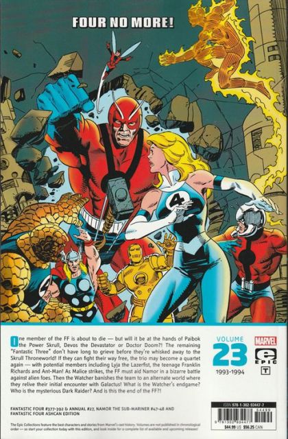 Four no more! One member of the FF is about to die - but will it be at the hands of Paibok the Power Skrull, Devos the Devastator or Doctor Doom?! The remaining "Fantastic Three" don't have long to grieve before they're whisked away to the Skrull Throneworld! If they can fight their way free, the trio may become a quartet again - with potential members including Lyja the Lazerfist, the teenage Franklin Richards and Ant-Man! As Malice strikes, the FF must aid Namor in a bizarre battle against alien foes. Then, the Watcher banishes the team to an alternate world where they relive their initial encounter with Galactus! What is the Watcher's endgame? Who is the mysterious Dark Raider? And is this the end of the FF?! Collecting FANTASTIC FOUR (1961) #377-392 and ANNUAL #27, NAMOR THE SUB-MARINER #47-48 and FANTASTIC FOUR ASHCAN EDITION. Rated T