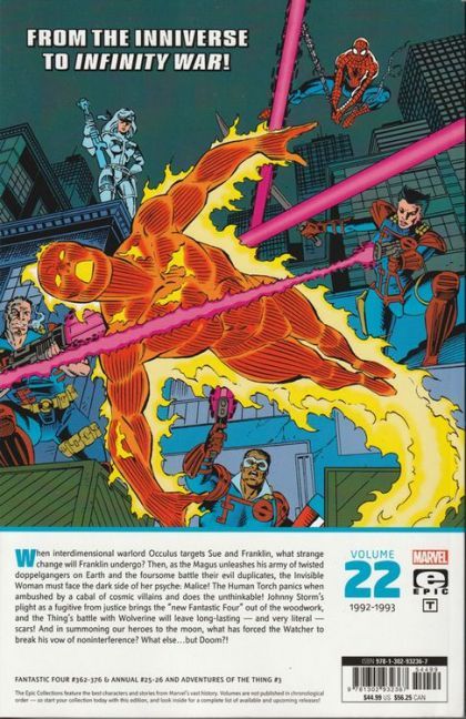 Volume #22 in the Fantastic Four Epic Collections From the Inniverse to INFINITY WAR! When interdimensional warlord Occulus targets Sue and Franklin, what strange change will Franklin undergo? Then, as the Magus unleashes his army of twisted doppelgangers on Earth and the foursome battle their evil duplicates, the Invisible Woman must face the dark side of her psyche: Malice! The Human Torch panics when ambushed by a cabal of cosmic villains and does the unthinkable! Johnny Storm's plight as a fugitive from justice brings the "new Fantastic Four" out of the woodwork, and the Thing's battle with Wolverine will leave long-lasting - and very literal - scars! And when Uatu summons our heroes to the moon, what has forced the Watcher to break his vow of non-interference? What else...but Doom?! Collecting FANTASTIC FOUR (1961) #362-376 and ANNUAL #25-26, and ADVENTURES OF THE THING #3. Rated T