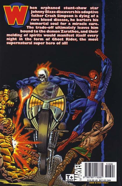 Written by ROY THOMAS, GERRY CONWAY, LEN WEIN, MARV WOLFMAN & MIKE FRIEDRICH Penciled by MICHAEL PLOOG, JIM MOONEY, TOM SUTTON & HERB TRIMPE When orphaned stunt-show star Johnny Blaze discovers his adoptive father Crash Simpson is dying of a rare blood disease, he barters his immortal soul for a miracle cure. The trade-off ultimately leaves him bound to the demon Zarathos, and their melding of spirits would manifest itself every night in the form of Ghost Rider, the most supernatural super hero of all! Collecting MARVEL SPOTLIGHT #5-12, GHOST RIDER #1-20 and DAREDEVIL #138.