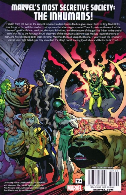 Witness the secret tragedies of Marvel's most secretive society: the Inhumans! Hidden from the eyes of the ancient Inhuman leaders, Queen Medusa gives secret birth to King Black Bolt's son, Ahura - but will the newborn heir apparent be a blessing or a curse? Then: Experience the revolt of the Inhumans' genetically bred servitors, the Alpha Primitives, and the creation of the god-like Trikon in the untold story that led to the Fantastic Four's discovery of the Inhuman race! How was Medusa lost to the world of man, and how did Black Bolt's insane brother Maximus the Mad usurp the throne? If you've read the Inhumans' classic Silver Age debut, you only know half the story! Guest starring Quicksilver and the Fantastic Four! Collecting MARVEL GRAPHIC NOVEL: THE INHUMANS and INHUMANS: THE UNTOLD SAGA.