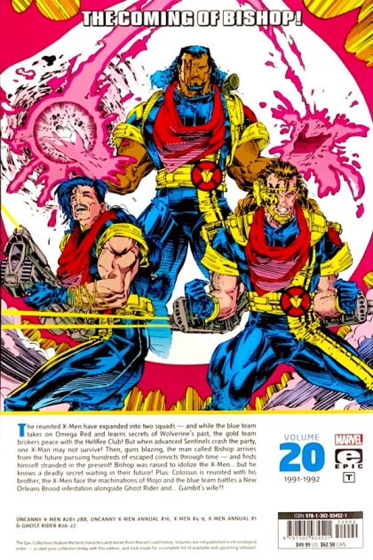 Volume #20 in the X-Men Epic Collections The coming of Bishop! The reunited X-Men have expanded into two squads - and while the blue team takes on Omega Red and learns secrets of Wolverine's past, the gold team brokers peace with the Hellfire Club! But when advanced Sentinels crash the party, one X-Man may not survive! Then, guns blazing, the man called Bishop arrives from the future pursuing hundreds of escaped convicts through time - and finds himself stranded in the present! Bishop was raised to idolize the X-Men...but he knows a deadly secret waiting in their future! Plus: Colossus is reunited with his brother, the X-Men face the machinations of Mojo and the blue team battles a New Orleans Brood infestation alongside Ghost Rider and...Gambit's wife?! Collecting UNCANNY X-MEN (1981) #281-288, UNCANNY X-MEN ANNUAL (1992) #16, X-MEN (1991) #4-9, X-MEN ANNUAL (1992) #1 and GHOST RIDER (1990) #26-27. Rated T