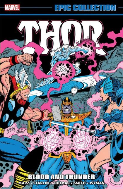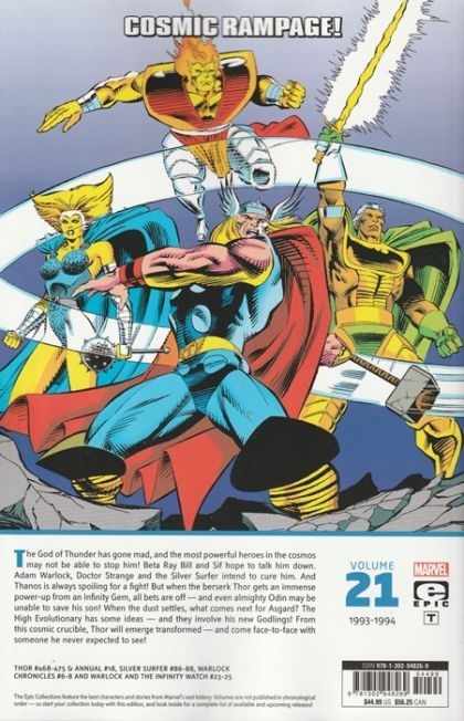 Thor on a cosmic rampage! The God of Thunder has gone mad, and the most powerful heroes in the cosmos may not be able to stop him! Beta Ray Bill and Sif hope to talk him down. Adam Warlock, Doctor Strange and the Silver Surfer intend to cure him. And Thanos is always spoiling for a fight! But when the berserk Thor gets an immense power-up from an Infinity Gem, all bets are off - and even almighty Odin may be unable to save his son! When the dust settles, what comes next for Asgard? The High Evolutionary has some ideas - and they involve his new Godlings! From this cosmic crucible, Thor will emerge transformed - and come face-to-face with someone he never expected to see! Collecting THOR (1966) #468-475 and ANNUAL #18, SILVER SURFER (1987) #86-88, WARLOCK CHRONICLES #6-8 and WARLOCK AND THE INFINITY WATCH #23-25.