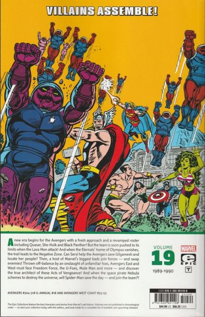 Villains assemble! A new era begins for the Avengers with a fresh approach and a revamped roster including Quasar, She-Hulk and the Black Panther! But the team is soon pushed to its limits when the Lava Men attack! And when the Eternals' home of Olympus vanishes, the trail leads to the Negative Zone. Can Sersi help the Avengers save Gilgamesh and locate her people? Then, a host of Marvel's biggest bads join forces - and swap enemies! Thrown off-balance by an onslaught of unfamiliar foes, Avengers East and West must face Freedom Force, the U-Foes, the Mole Man and more - and discover the true architect of these Acts of Vengeance! And when the space pirate Nebula schemes to destroy the universe, will Spider-Man save the day - and join the team?! Collecting AVENGERS (1963) #304-318 and ANNUAL #18, and AVENGERS WEST COAST #53-55. Rated T